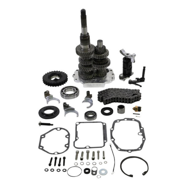 This is a 6-speed gear set (3.24:1 1st gear/.86:1 6th gear) with a 28-tooth motor sprocket, a longer primary chain, an adjusting shoe, a fixed spindle-shift drum and an anti-overshaft ratchet shift pawl assembly. It also features a bearing door that is constructed from 6061-T6 Aluminum, and has wider bearings as well as bearing retainer plates as opposed to the stock style snap rings. The gearsets are built from 8620 steel; the gears are cut prior to heat-treating then precision grounded with a diamond-coated tooling for quieter operation.