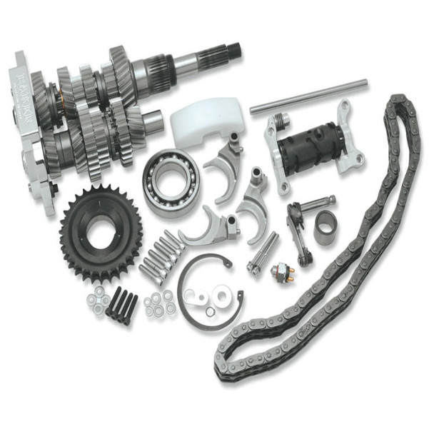This is a 6-speed gear set (3.24:1 1st gear/.86:1 6th gear) with a 28-tooth motor sprocket, a longer primary chain, an adjusting shoe, a fixed spindle-shift drum and an anti-overshaft ratchet shift pawl assembly. It also features a bearing door that is constructed from 6061-T6 Aluminum, and has wider bearings as well as bearing retainer plates as opposed to the stock style snap rings. The gearsets are built from 8620 steel; the gears are cut prior to heat-treating then precision grounded with a diamond-coated tooling for quieter operation.
