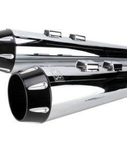 Bassani – 4″ Slip-On Mufflers W/ 2-1/2″ Performance Baffles fits ’95-’16 Touring Models – Megaphone, Chrome W/ Tapered Black Billet End Caps & Contrasting Flutes
