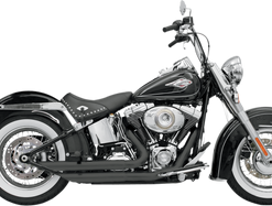 The Road Rage 2-into-1 Exhaust System by Bassani will enhance the performance of your Softail. This exhaust has a megaphone style muffler body and is available in Chrome w/ full chrome heat shields and Black w/ full black heat shields.